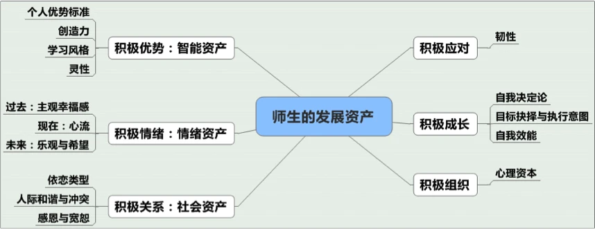 积极优势、积极情绪、积极关系三者关注的是人们可以用于自身发展的心理发展资产。部分研究者(Benson,1997)认为,人们的青少年的发展资产有40多种,分为外在资产及内在资产,青少年积极成长的课程计划的目的就在于培养青少年发展资产(developmental assets)。Catalano整理的15项积极成长的概念建构也可以看做成对青少年发展资产的一种归纳。同样,塞林格曼(Seligman,2008)在《积极心理学与积极教育》中提到的智能资源(intellectual resources)、社会资源(socail resources)也部分涉及到了人们的发展资产。无论是资产、概念建构还是资源,这三个词都可以用心理资产来代替。积极优势代表着人们的个人智能资产、积极情绪代表着人们的情绪资产、积极关系代表着人们的社会资产。