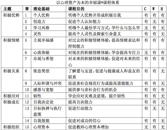 (一)上文的C是指Catalano体系中提到的15种青少年积极成长的概念,香港“共创成长路”计划依托的是此体系;W是指英国惠灵顿公学的幸福课课程体系;H是指Homewood高中的积极心理学7天入门的课程体系。