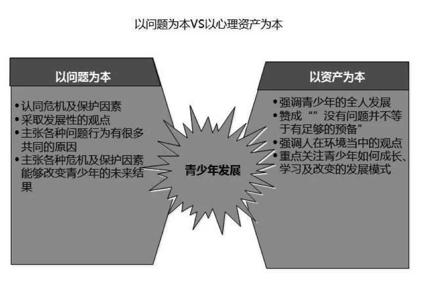 根据Catalano的整理,以问题为本与关注青少年积极成长(即以心理资产为本)的两种课程计划的各自特点如下: