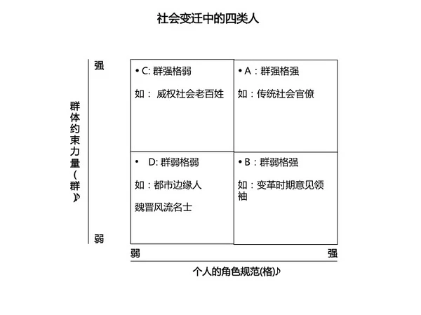 在A、B、C、D四类象限的文化中,我们该选择什么样的资本发展路径呢?以上四种资本,又各侧重什么呢?哪些资本更侧重群?哪些资本更侧重格?在一个群弱格弱的魏晋时代,你选择一个发展个人政治资本的路径,真的能够获得多大的幸福感或者人生自由度?身处一个群弱格强的企业中,你使劲发展社会资本,能获得多大的提升?你已经拥有的各类资本,各自比例与平衡如何呢?