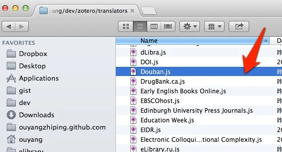 /users/ouyang/dev/zotero 下面的translators目录里面。如下图所示: