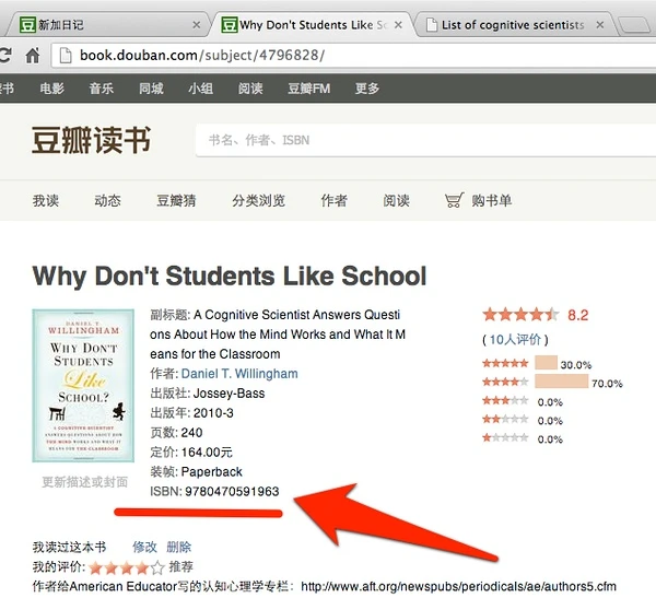 让我们以前一篇文章我们为什么害怕学习为例,通过豆瓣,找到Why Don't Students like School这本书的ISBN是:9780470591963。如下图所示: