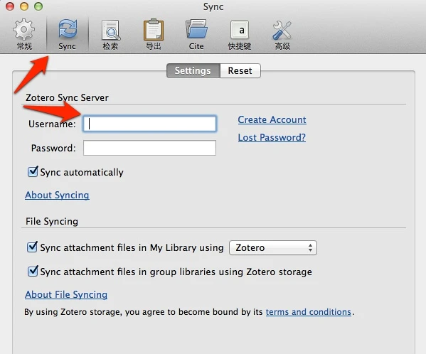在同步一栏输入前面注册的账号,这样,文献库可以同步到Zotero官网。