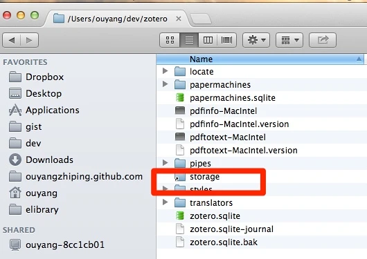 Zotero官网默认的存储空间有限,所以,我们需要一个小技巧,将文献库里面保存PDF文档的目录,分离开,放到dropbox目录下同步。回到刚才创建的:/users/ouyang/dev/zotero 目录,其中的storage目录是拿来保存PDF等文档的,将其剪切到dropbox目录下,如下图所示: