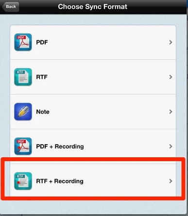 接下去,选择同步格式了。又是个关键步骤,一般建议选择rtfd格式。这是富文档格式,这样才能够直接保存录音、图片等。