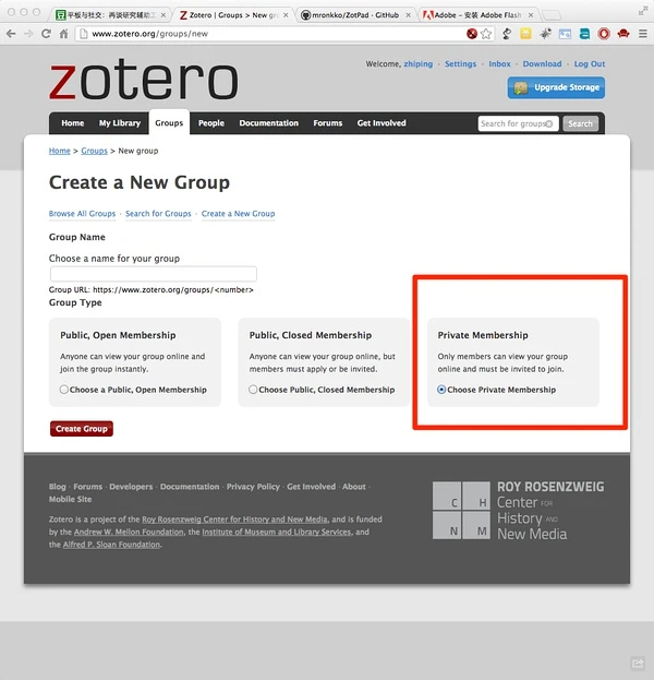 有很多需要拉人讨论或者实验室、课题组共享一批文献。则可以在Zotero里面,创建一个私密或者公开的群组。如下图所示:
