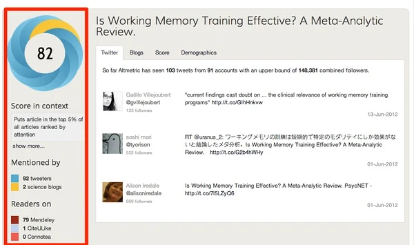 打开网页,然后点击Chrome书签栏上,我们在前一个步骤创建的书签:Altmetric。奇迹发生了!我们获得了一个分数,以及获得了全世界主要的媒体、博客、推特们对这篇文献的讨论。它是社交媒体中非常热门的一个讨论话题。(当然,在中国并不热门:D)如下图所示: