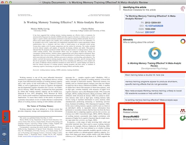 但是,很多PDF文档,事先下载好了,我们一篇一篇这么去查它的社交媒体影响力,岂不是累死?专为研究2.0时代而生的Utopia来了!同样是免费、跨平台。下载地址是: