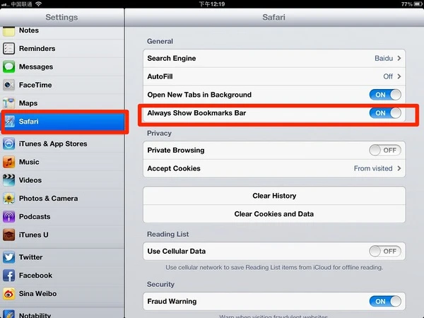 步骤2,打开iPad的设置,找到Safari,如下图所示,将【总是显示书签栏】给选为【on】。