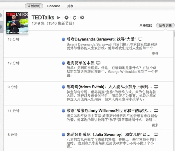以上方法适用于一切批量下载的优质课程,同样,我们还可以直接使用iTunes U功能,即大量优质课程,如TED的itunes u课程尤其值得参与: