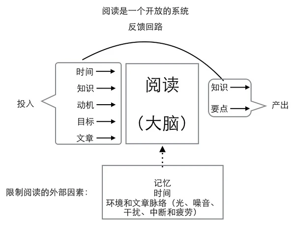 在阅读前,五个投入,每个都有一个初始值,这个值将会随时间变化,因为产出影响投入。当你能够从文本中产生的知识与要点有限时,你可能就会放弃,或者再增加投入。而限制整个反馈回路进行的是大脑结构的一些基本特点,以及一些周边的环境因素,如噪音、光线等。动机则制约了你在一定时间内,能投入到文本上的整体能量。