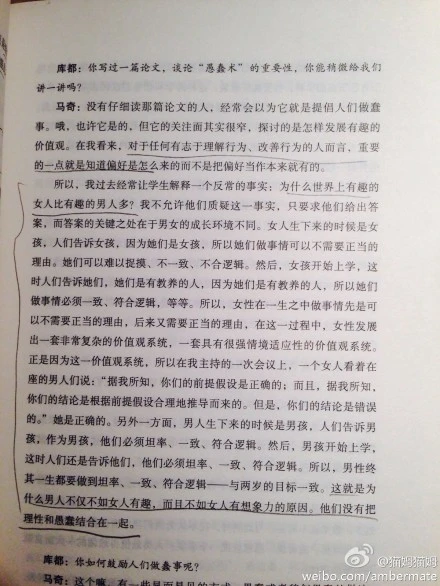 “世上有趣女孩远远多于有趣男生”这句话语出《哈佛商业评论》记者对马奇的采访,见下图: