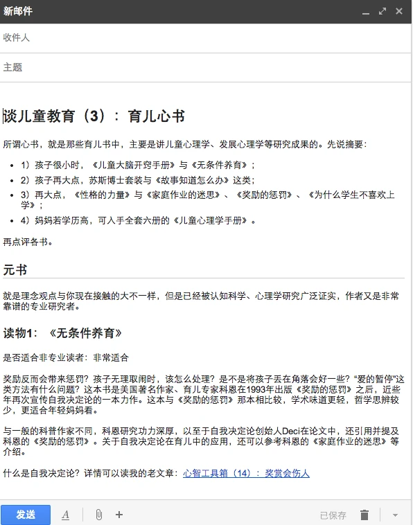 如果你习惯用Markdown了,那么,装上Chrome插件Markdown here,在gmail撰写邮件界面,写好后,轻轻一点,你的邮件就变成漂亮的文档了。