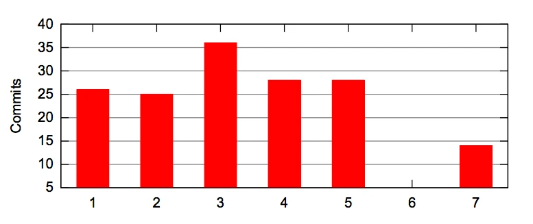 Github 伟大的地方是,它可以记录人们的学习与创作轨迹了。我的创作自从2011年以来,几乎都托管在Github。因此,分析我的时间,可以调用 Github 的 commit 数据,更清晰地感知。比如,这是我2011年某月的 commit 的频率与分布。