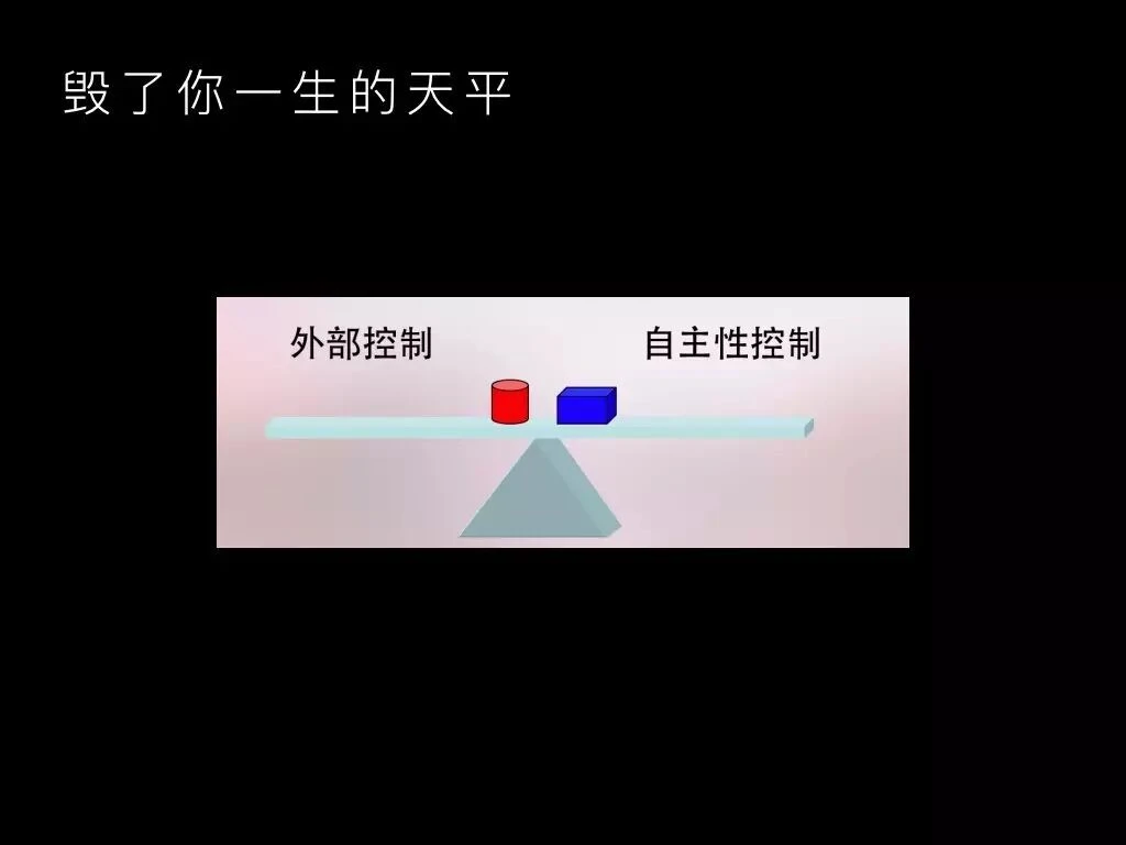 人生好比一个跷跷板游戏。人每天只有二十四小时,你越在外部控制上妥协越多,你就越不能自主;你越重视外部奖赏,你就越来越不善于处理自己内在时钟。随着天平一天一天地倾斜,总有一天,你再也无法恢复自主状态,你的一生从此就这样不知不觉被毁掉了。多数人在安稳度过第一次青春期危机后,却在第二次青春期危机止步不前。以多数人的敏感与志向,甚至到了三四十来岁的时候,压根没发现过第二次青春期危机,就此平淡结束一生。