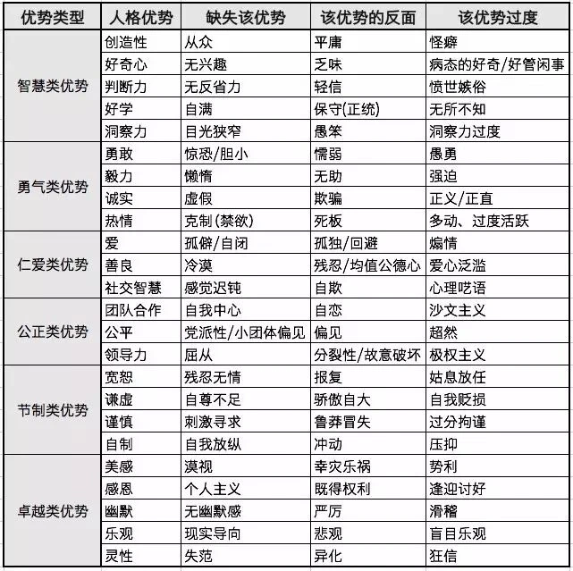 创造:隶属于智慧类美德,缺失该人格优势,导致「从众」;该人格优势反面是「平庸」;该优势过度导致「怪癖」。
