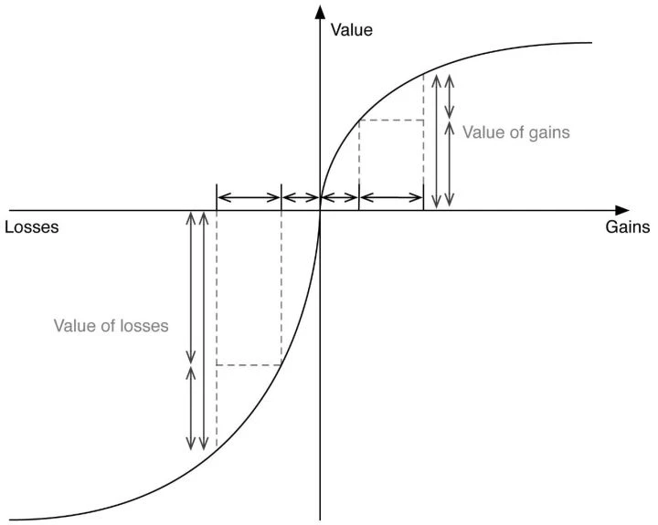 个人偏好是基于偏离基于一个相对的参照水平的程度而其变化的(Reference-dependent preference)而非取决于一个绝对量(如财富水平等)。相对于这个参照水平“得”带来快乐,“失”导致痛苦。而从图中对此损失与收益这两段曲线的斜率(前者几乎为后者的二倍),这说明:人们对损失的感受性要大于对收益的感受性,即我们平时所说的损失厌恶。