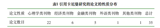 Kanhnman的研究对中国的学术界也产生了重大影响,对收录在中国期刊网全文数据库中的所有论文(1994年-2002年10月)进行检索,使用引文查询的方式,关键词为Kanhnman,共检索出35篇论文,\1\ 由于中国期刊网收录的学术期刊较全与权威,我们认为该检索结果基本上可以代表Kanhnman近年来对中国学术界的影响。其中,论文的性质分布如下: