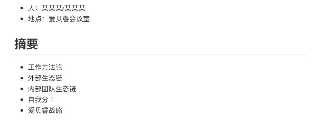 上述标题,简单地说明了会议要点。对于常规会议的备忘,一般是时间在前,按照时间排序容易看懂,也能形成累积效应。
