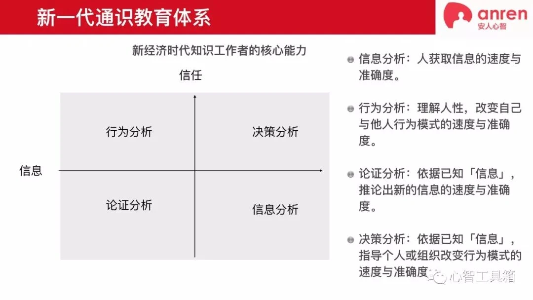 我设计的通识四课,各自解决的问题有所侧重:其中信息分析,重点解决人获取信息的速度与准确度;而获取高质量的信息之后,并不意味着结束。面对同样的信息,少数人能够据此有效地分解信息、证据、观点,继而推出有效的结论,而大多数人并未掌握这样的能力。