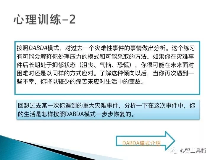 这是当时汶川地震期间,我主编《灾后心理自助手册》一书的配套课件,分别是当时给普通人、职业救助者(医护人员、军人警察与灾区干部等等)、幸存者、志愿者的心理训练方法。欢迎各位自取。网址:http://qr32.cn/BbD3B0
