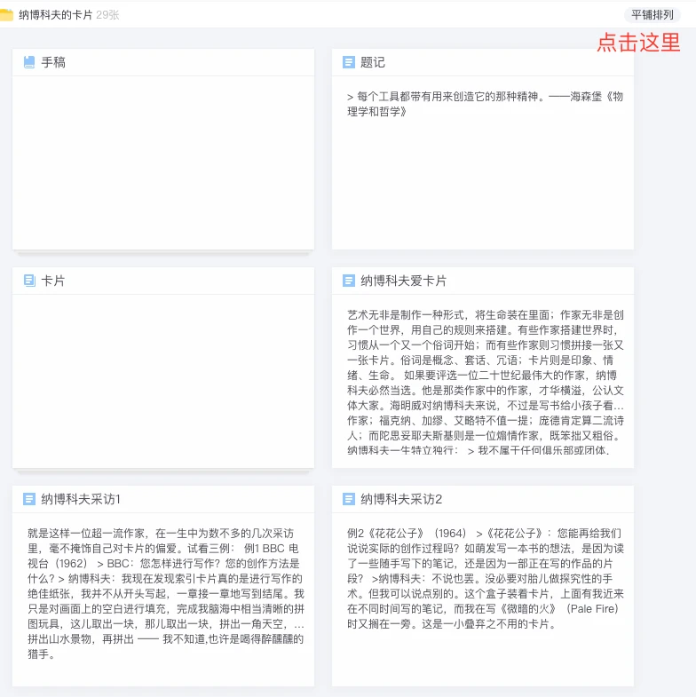 如果你点击右边的按钮,切换为「平铺排列」,则将显示当前卡片+当前卡片的下一级子卡片+下一级子卡片的子卡片。如下图所示: