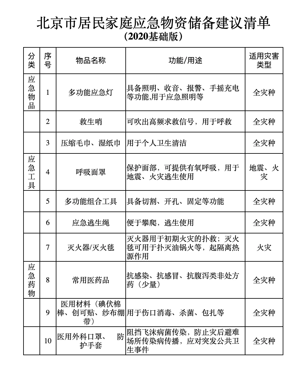 去年年底,北京市应急管理局组织专家修订了最新版。新版建议清单包括基础版和扩充版两个版本。其中,基础版包括应急物品、应急工具和应急药物 3 类应急物资。如下: