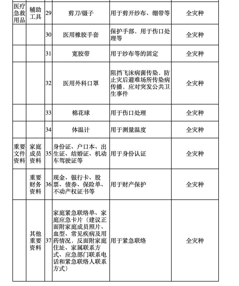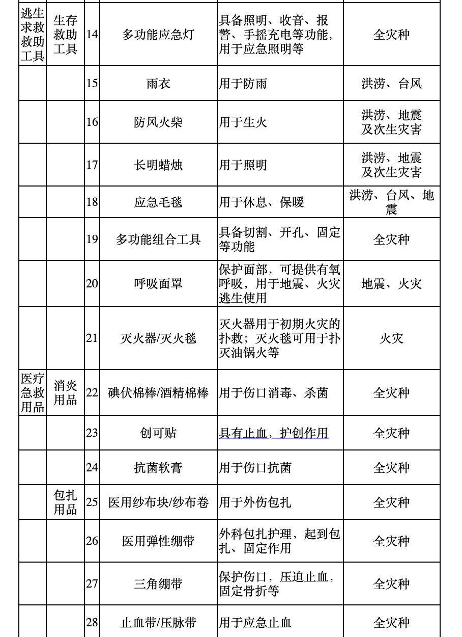 9、相对 2014 年的旧版来说,2020 年的新版多了一列:「适应灾种」。其中基础版的清单,建议大家在家里、车上常备,各一份。包里常备救生哨与逃生绳即可,适应全灾种。