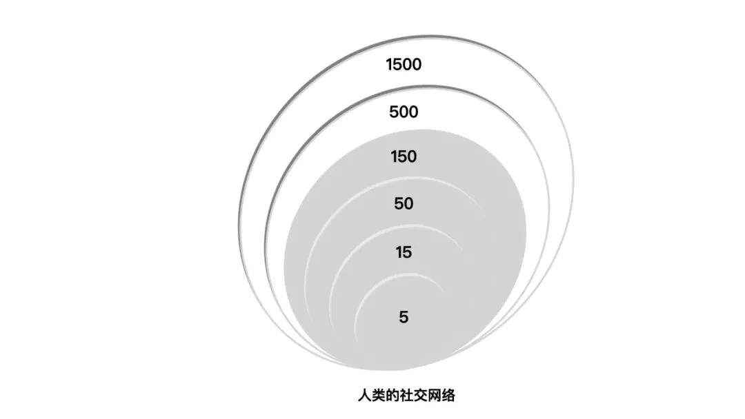 按照英国进化心理学家邓巴的研究,人类从远古狩猎-采集时代到近代,你的社交网络始终由一系列层层包含的圈子构成,每个层次都比它相邻的内部层次大三倍。你可以按照亲疏远近,将这些圈子分为亲密朋友(最里层的 5 人)、最要好的朋友(15 人圈)、好朋友(50 人圈)、朋友(150 人圈)、认识的人(500 人圈)以及脸熟但叫不出名字的人(1500 人圈)。最为内部的四个层次(到 150 人圈),一半是家人一半是朋友。超过 150 人之后,变为纯随机认识,没有一人是家人。如下图所示。