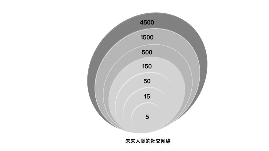 4500 人也是不少社交达人的好友数量上限。意向层次的层级跃迁,意味着人类能与更多人共享心智模型。绝大多数动物生下来,能够借助于身体触摸,与 5 位左右的同胞家属等达成连接;借助于肢体语言,可以与 15 位左右的同族达成连接;一旦需要与 50 人连接,就不得不借助于口头语言;到了 150 人、500 人,不得不借助符号语言。正是语言的诞生,人类通过故事,相互连接在一起,从此,有了部落、村庄与城市。信息与信任构成了人类历史的两大基本命题。从三个意向层次跃迁到六个意向层次以上,我们从猿猴成为人;从六个意向层次跃迁为九个意向层次以上,我们从人变为超级人类。这就是当前人类所处的演化周期。伟大作家普遍在第六层级的意向层次工作;同样,刚刚萌芽的虚拟现实技术,将把人类普遍带入到第七层级的意向层次。当有一天,人类的社会认知能力能够同时触及四万人时,那时人类正式步入超级人类时代。