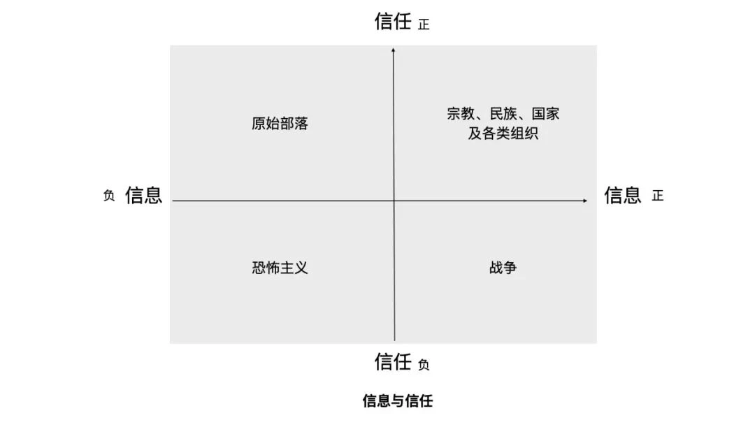 正信息负信任:人与人之间依然相互敌对,难以构建信任,但创造新信息。典型形态如人类战争,带来了文化交流。
