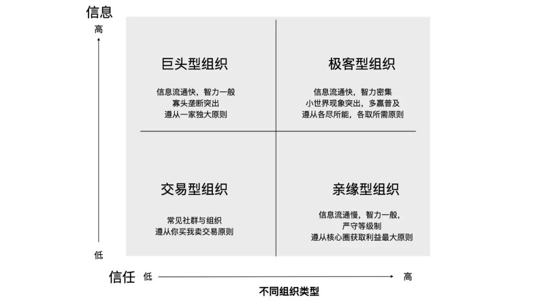 极客型组织。极客型组织既是高信息流,又是高信任流。典型莫过于早期的谷歌、早期的 GitHub,还有早期的 37Signals。这类组织的特征是信息流通快,智力密集,小世界林立,多赢普及。团队成员遵循「各尽所能,各取所需」原则。