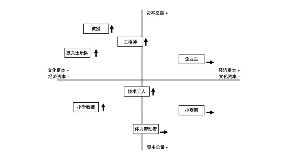 布迪厄将人的资本划分为经济资本、文化资本、社会资本与符号资本四种。在为社会空间做图示时,为简化问题,他常常只通过文化资本与经济资本来定位社会不同阶层所处的位置。上图中箭头方向表示阶层跃迁状况。